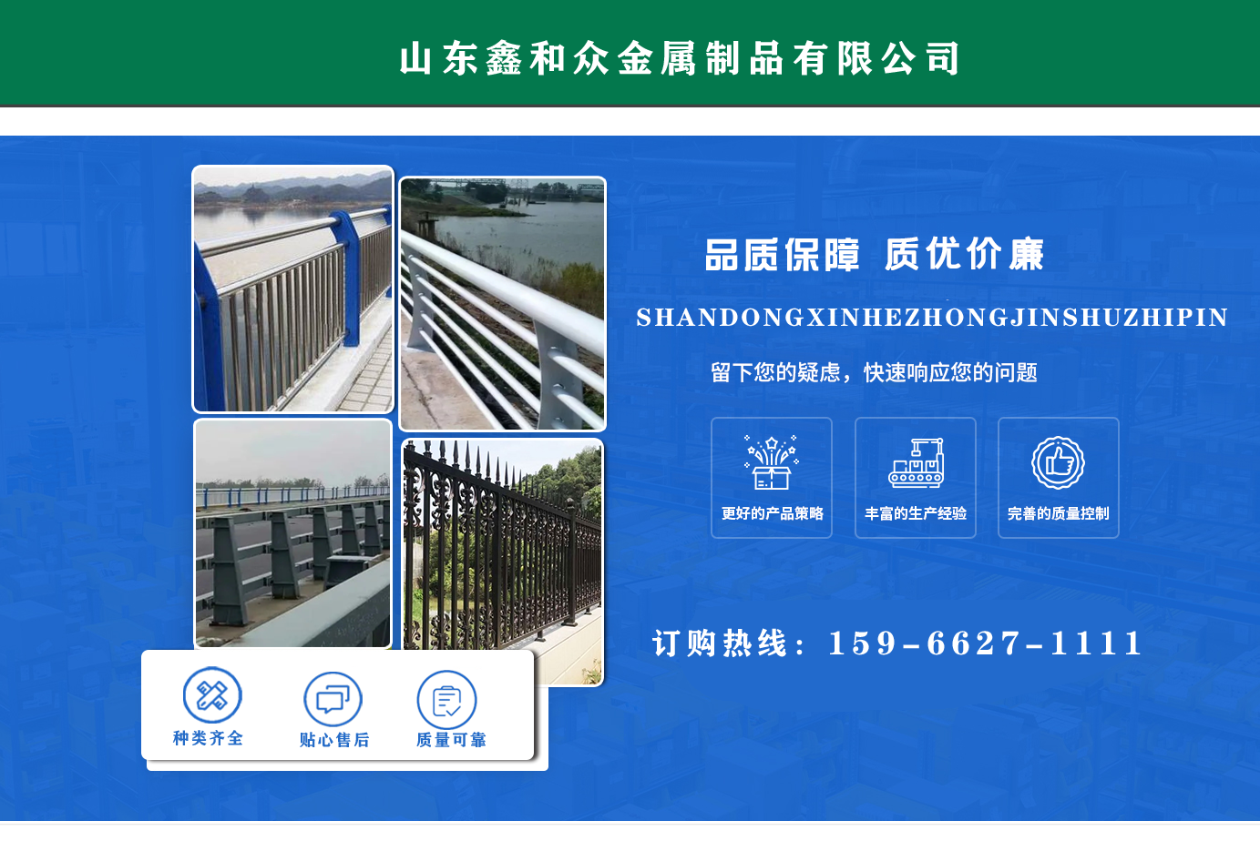 山東鑫和眾金屬制品有限公司主要產(chǎn)品有防撞護(hù)欄,橋梁護(hù)欄,道路護(hù)欄,河道護(hù)欄,不銹鋼護(hù)欄等護(hù)欄。提供設(shè)計方案,一站式定制,包您滿意價格優(yōu)惠,歡迎來電咨詢!    公司常年從事銷售護(hù)欄防撞護(hù)欄,橋梁護(hù)欄,道路護(hù)欄,河道護(hù)欄,不銹鋼護(hù)欄,橋梁鋼護(hù)欄,河道燈光護(hù)欄等。產(chǎn)品廣泛應(yīng)用于橋梁、河道、旅游景區(qū)、道路、公路、公園、小區(qū)、景觀、道路防撞等領(lǐng)域。    公司產(chǎn)品均采用優(yōu)質(zhì)不銹鋼材料,符合相關(guān)標(biāo)準(zhǔn)。各種型號不銹鋼復(fù)合管及護(hù)欄,質(zhì)量嚴(yán)格把控。產(chǎn)品強(qiáng)度高、耐腐蝕、焊接牢固、抗沖擊、性能好,防撞護(hù)欄結(jié)構(gòu)簡單、美觀實(shí)用大方。     歡迎前來訂購!...